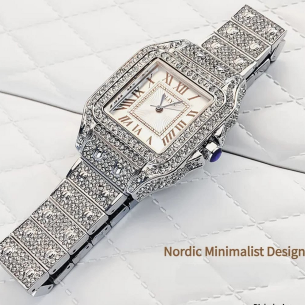 سلسلة: ساعة نسائية فضية مرصعة بالكريستال مع مينا أبيض
